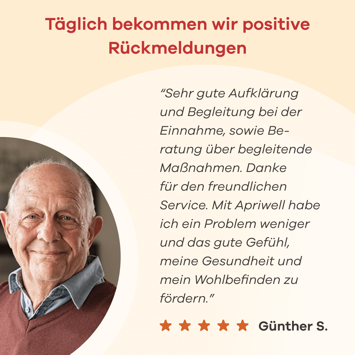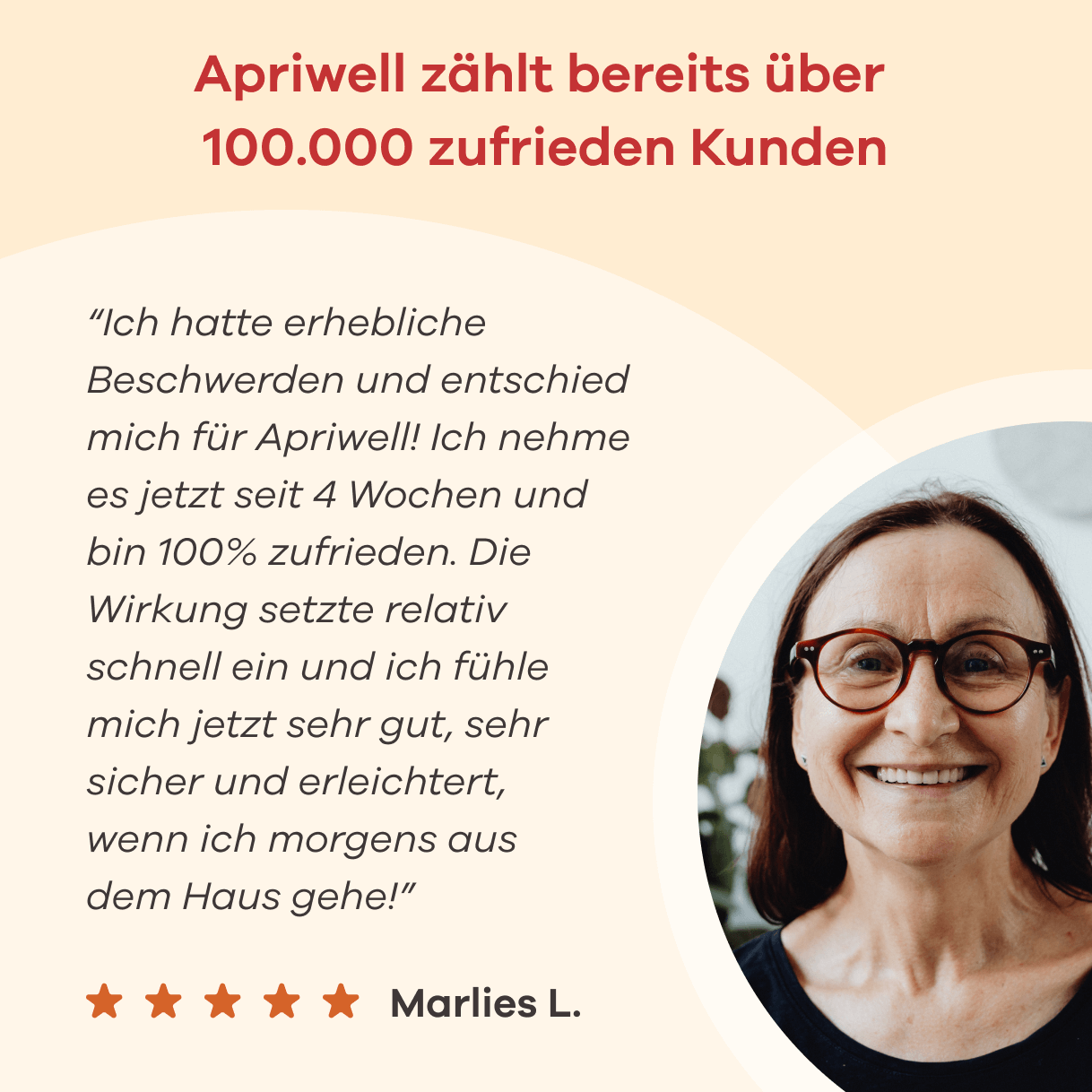 "Seit meiner Darmkrebs OP habe ich immer wieder Krämpfe und Blähungen nach den Speisen. Apriwell hilft da sehr gut 👍"
