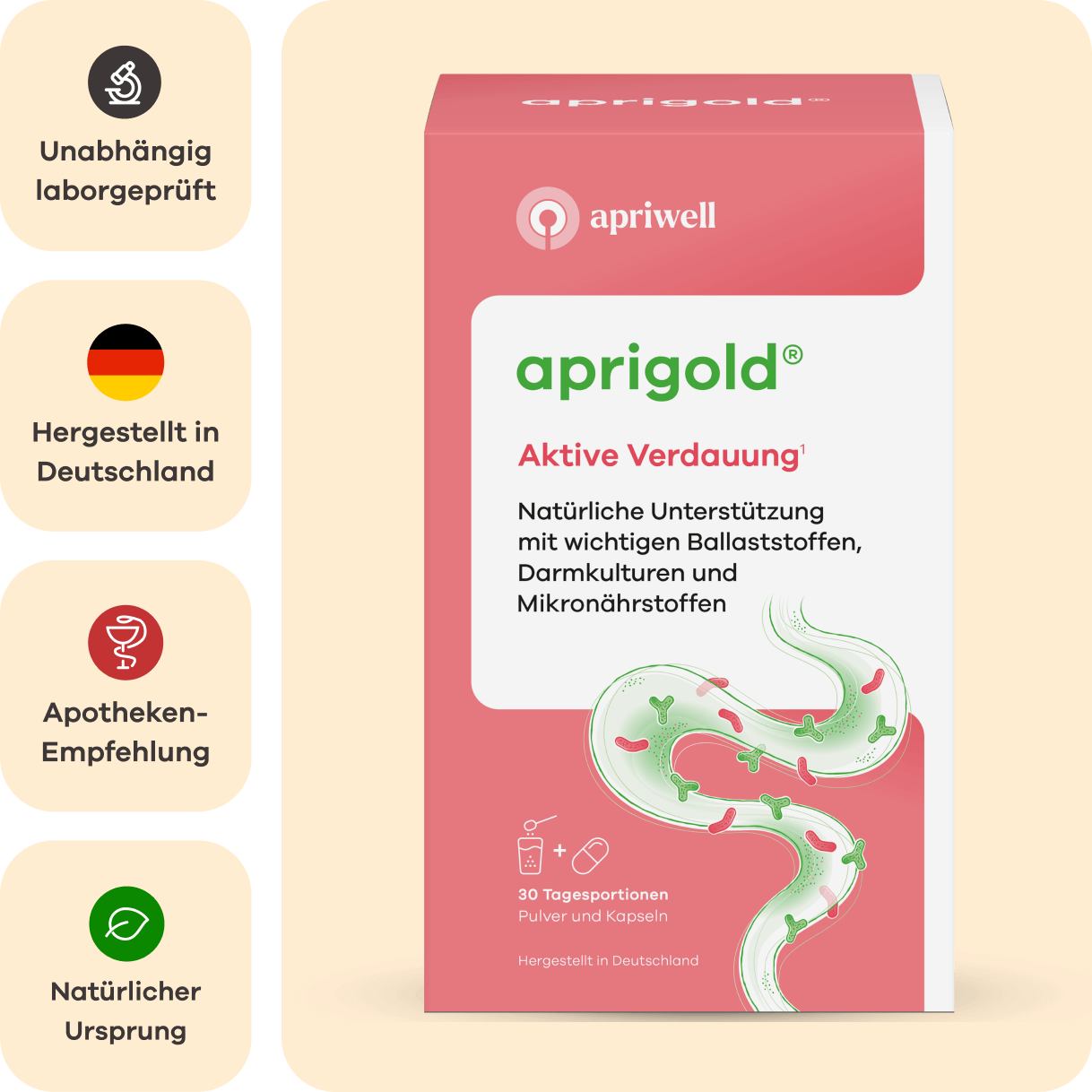 Mit Aprigold werden nicht nur Symptome, sondern die Ursache der Verdauungsbeschwerden an der Wurzel gelöst. Um dies zu gewährleisten, empfehlen wir, mit einer regelmäßigen Einnahme über mindestens 3 Monate (3 Packungen) zu beginnen.