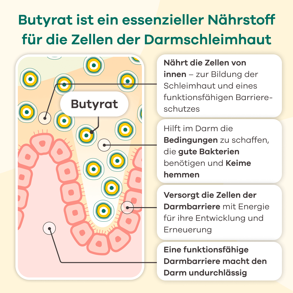 Butyrat ist der wichtigste Energielieferant für die Zellen der Darmschleimhaut. Die Zellen sind auf Butyrat angewiesen, um sich richtig zu entwickeln und ihre Barriere- und Schutzfunktion auszuüben.