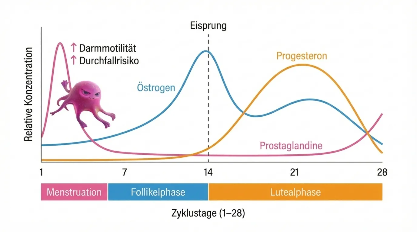 Während der Menstruation schüttet der Körper Prostaglandine aus. Diese lösen nicht nur das Zusammenziehen der Gebärmutter aus, sondern regen auch den Darm an – mit der Folge von häufigem, weichem Stuhl oder Durchfall. Kurz vor der Periode bremst Progesteron die Darmbewegung, was Blähungen und Verstopfung verursacht. Fällt der Spiegel dann abrupt ab, wird der Darm plötzlich aktiv und reagiert oft mit Durchfall. Auch Östrogen beeinflusst die Flüssigkeitsaufnahme im Darm und kann die Verdauung zusätzlich aus dem Gleichgewicht bringen.