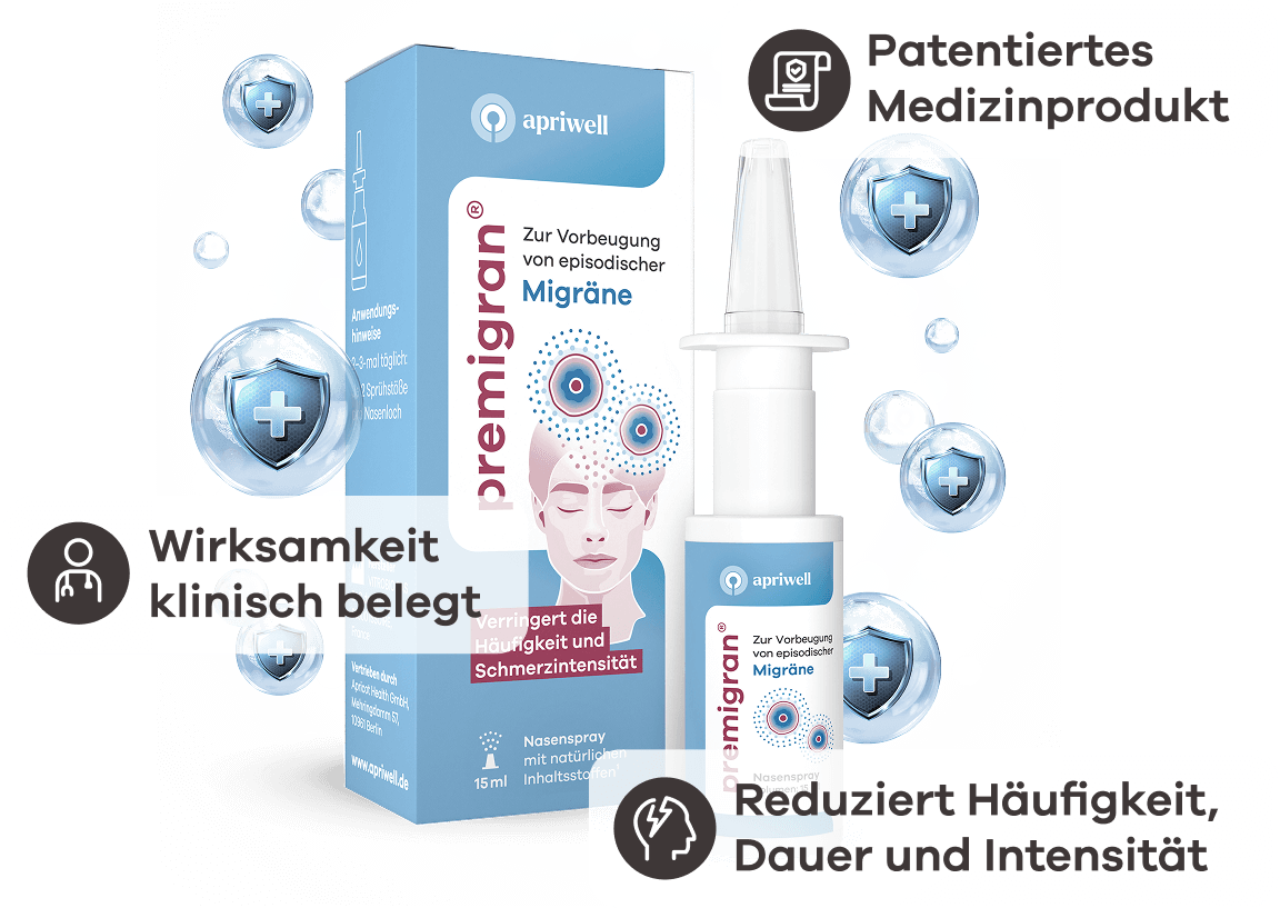 Das kann Premigran. Es wirkt wie ein Schutzschild für die Nasenschleimhaut und schützt sie vor äußeren Reizen, die einen Migräneanfall auslösen können.