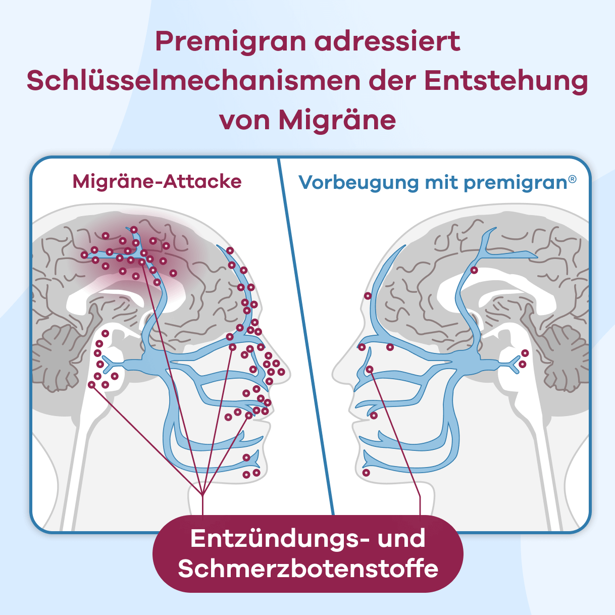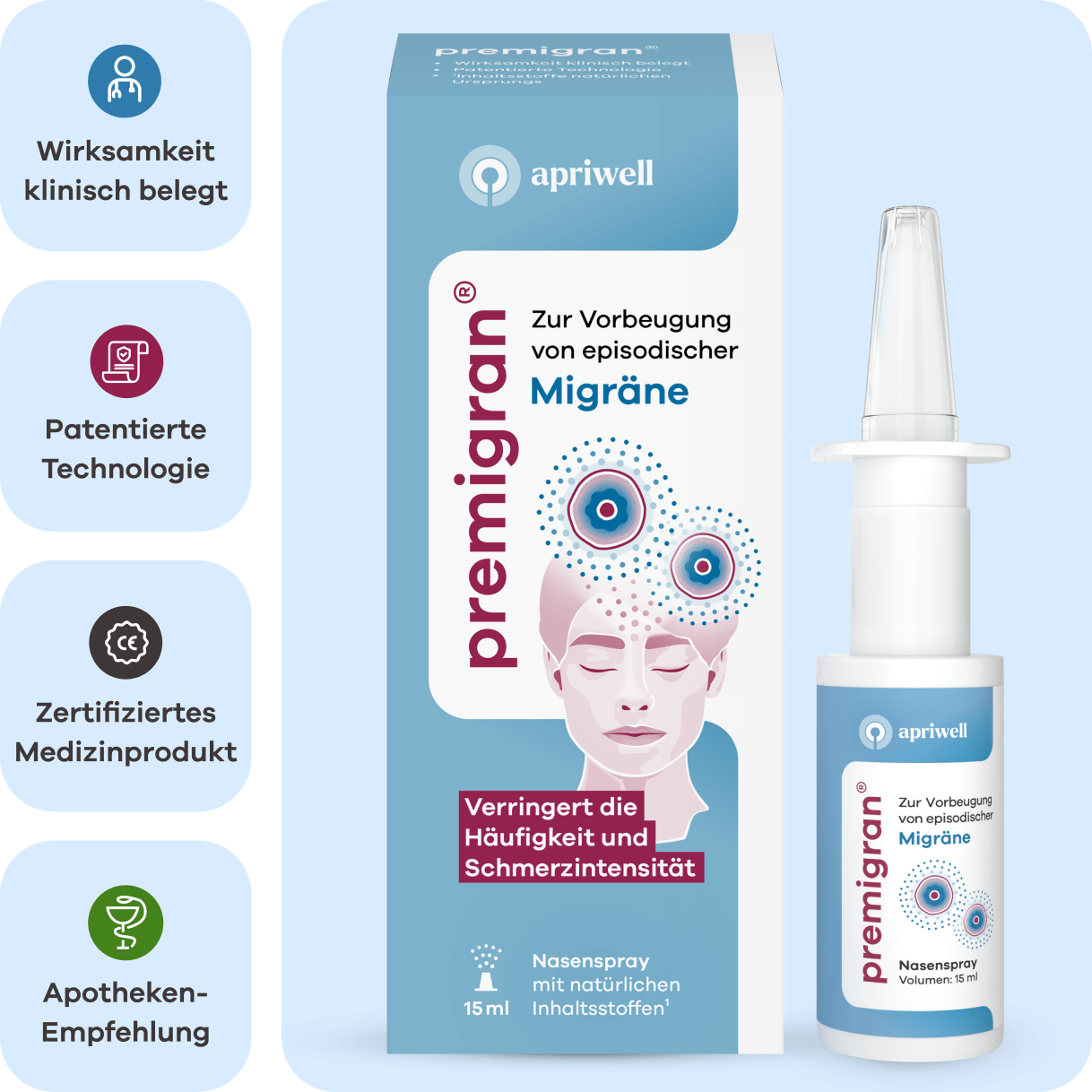 Premigran bildet einen gezielten Schutzfilm auf der Nasenschleimhaut. Dieser hält äußere Auslöser fern und entfernt innere Schmerz- sowie Entzündungsbotenstoffe, beispielsweise CGRP. Dies trägt dazu bei, die Reizung des Trigeminusnervs zu verringern.
