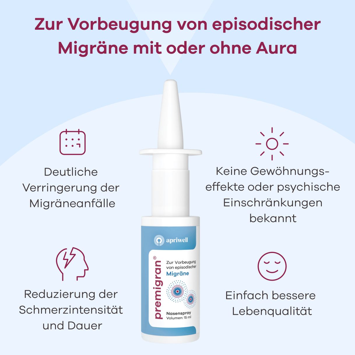 Premigran ist eine einzigartige und natürliche* Vorbeugung von episodischer Migräne. Es ist klinisch geprüft und hat aufgrund seiner osmotischen Wirkweise keinen Gewöhnungseffekt. Außerdem beeinträchtigt es weder die psychische Gesundheit noch die Leistungsfähigkeit. Es hat keine systemischen Nebenwirkungen und beugt trotzdem Migräne effektiv und zuverlässig vor.