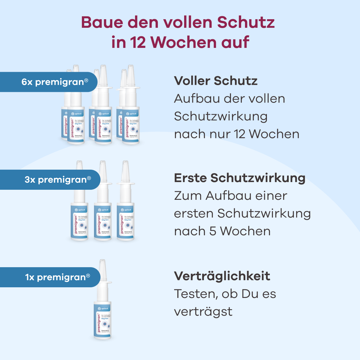 Schon ab der 5. Woche der Anwendung merkst Du einen deutlichen Rückgang der Migränehäufigkeit und Intensität – das zeigen die klinischen Studien. Die vollständige Schutzwirkung stellt sich ab 12 Wochen Anwendung ein und bleibt bei einer täglichen Anwendung bestehen.